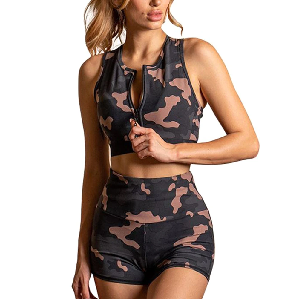 New Women Sports Clothing Suit Crop Tops+Shorts Sleeveless High Waist Camouflage Clothes Set XD88