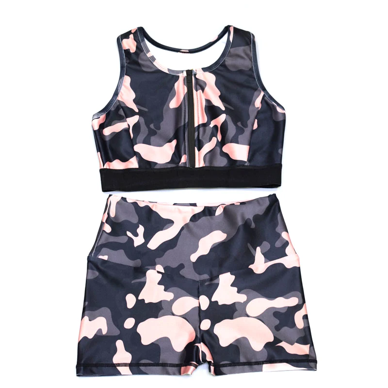 Premium Price of New Women Sports Clothing Suit Crop Tops+Shorts Sleeveless High Waist Camouflage Clothes Set XD88